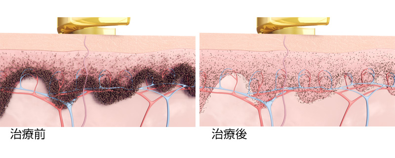 色素を微粒子への物理的に破壊する最新の技術により傷の治りが早く安全と言われています。 従来のレーザー(Qスイッチ)は、照射時間がナノ秒(10億分の1秒)単位の治療ですが、ピコウェイレーザーは照射時間がピコ秒(1兆分の1秒)単位で破壊し分解することができます。 照射時間が極めて短いことで、熱発生がほとんどなく、痛みや皮膚へのダメージ(照射後の赤み・黒ずみ)が最小限に抑えられます。